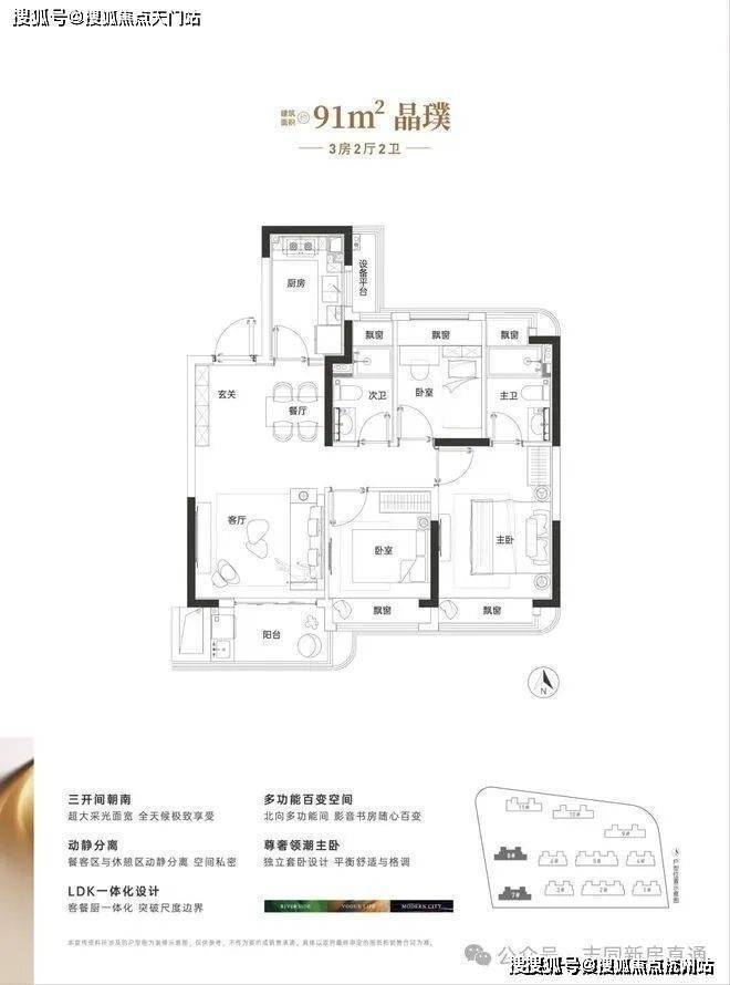 建面约91㎡做3房2卫,三开间朝南、3房5飘窗1阳台,整体室内的采光、视野以及通风都相当出彩。动静分离+主卧套房的设计,保证了整体居住的安静和私密性。