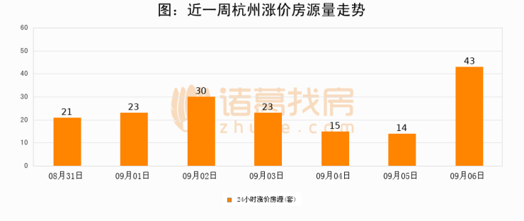 根据诸葛找房数据显示,杭州24小时涨价房源量为43套,较09月05日增加29套,环比上涨207.1%。与此同时,涨价房源占比小幅扩大,业主信心有所提升。