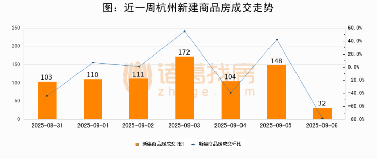根据杭州市住房保障和房产管理局数据显示,2025年09月06日杭州新建商品房成交32套,较昨日减少116套,环比下降78.4%。近一周杭州新建商品房日均成交112套。09月06日单日成交32套,低于近一周平均水平71.4%。
