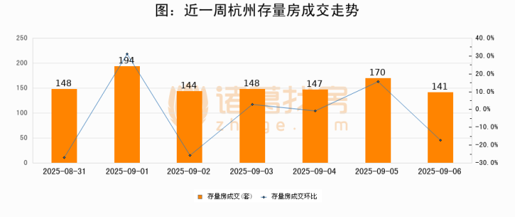 从存量房来看,2025年09月06日杭州存量房单日成交141套,比昨日减少29套,环比下降17.1%。从近一周存量房成交来看,杭州存量房日均成交套数为156套,09月06日单日成交141套,低于近一周平均水平9.6%。
