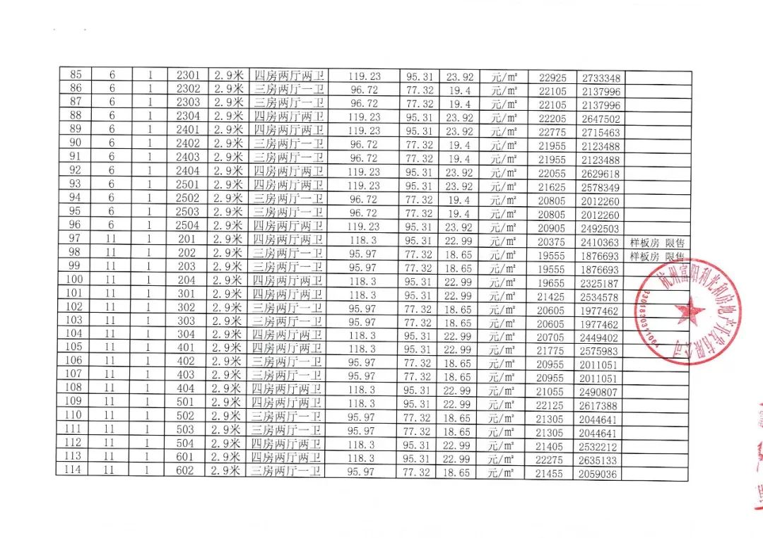 本次预售项目为悦江府 6、11 #,共2 幢。参与本次摇号的住宅房屋套数 190 套,其中建筑面积约96方三房两厅一卫房源 95 套,建筑面积约118方四房两厅两卫房源 95 套;住宅建筑面积 20436.29 平方米。住宅房源装修情况为 √ 精装 □毛坯,房源均价21999.93元/平方米,其中装修标准4000元/平方米。本次销售房源清单附后。