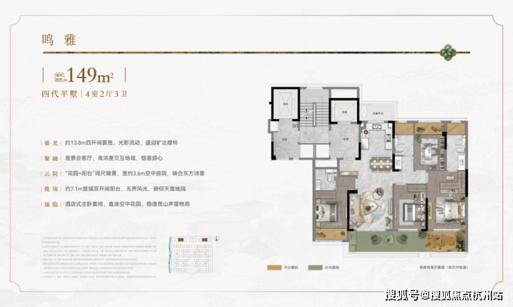 作为昆山 首座「庐」系 作品,绿城·鹿鸣东方以“宋风雅韵”为理念,规划约1.2容积低密住区,仅71席面积235-350㎡的宋风合院与158席建面约149㎡、178㎡的四代平墅。