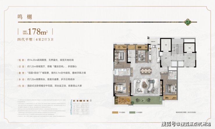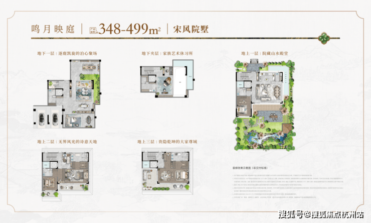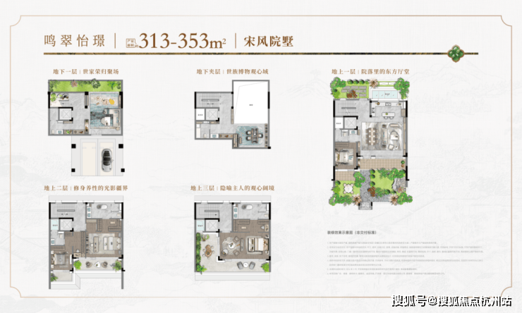 在合院产品中,开创性引入 “一宅六院” 设计,构建出地下挑高光院、南向诗意庭院、北向入户礼院、二层观景静院、三层巨幕心院、三层露台星院。