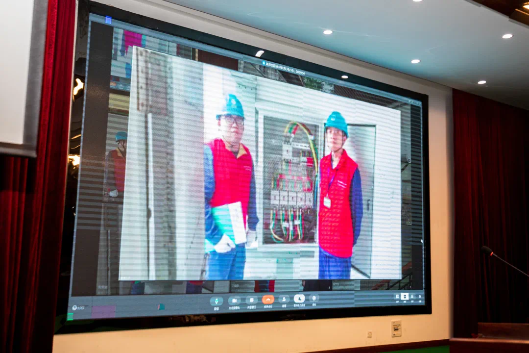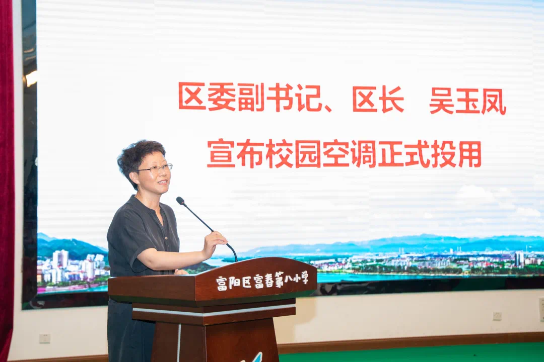区委副书记、区长吴玉凤宣布富阳区公办中小学空调正式投用,现场大屏幕上实时播出了9个代表学校空调开启场景。