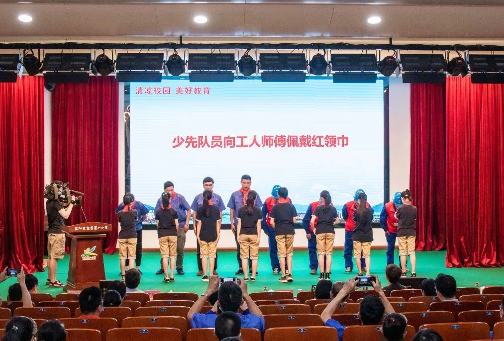 活动中,富春八小学子为参与学校电力改造和空调安装工程的工人师傅们系上红领巾,向所有工人师傅的辛勤劳动表示由衷地感谢。