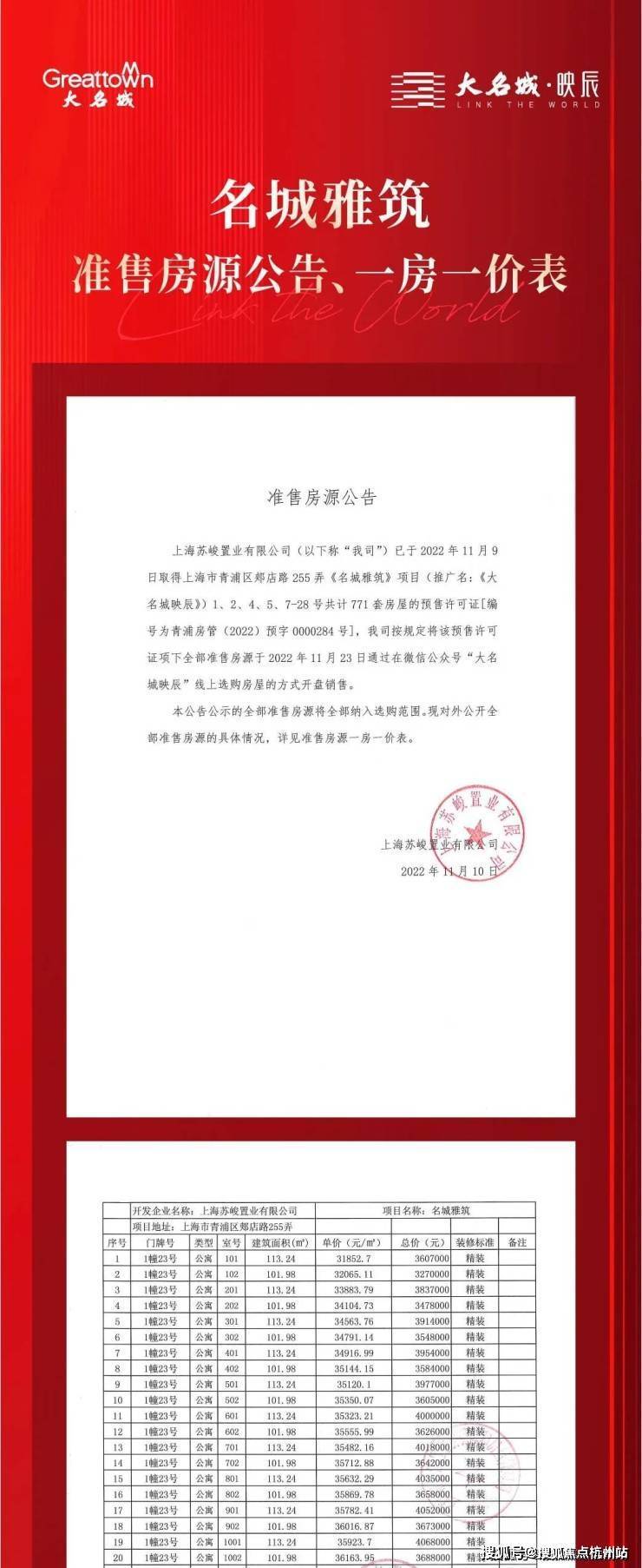 在2021年12月上海第三批集中供地中,大名城以底价摘得青浦区重固镇郏店路南侧44a-01地块,成交总价13.5亿元,成交楼板价16000元/㎡,房地联动价3.48万/㎡,即如今的大名城·映辰。