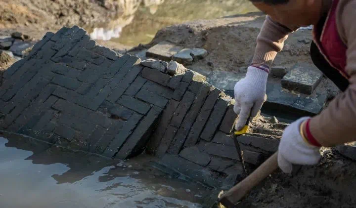 考古人员在清理发掘出的地砖