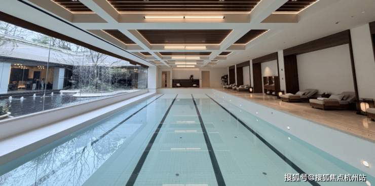 泳池内饰整体为米白色大理石搭配木色铝板,西班牙白沙石材,温润如玉,表里如一,靠庭院一侧为全落地窗,营造无边泳池的视觉效果,宛若游于中庭,却是色彩和视觉的共鸣。