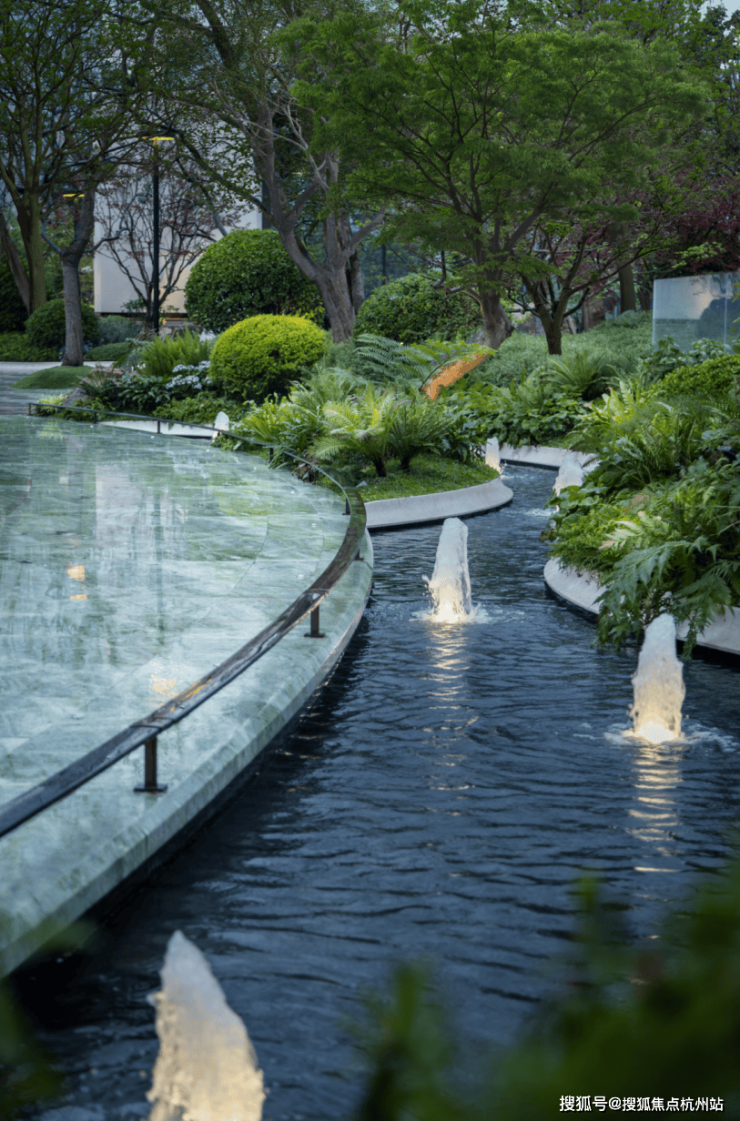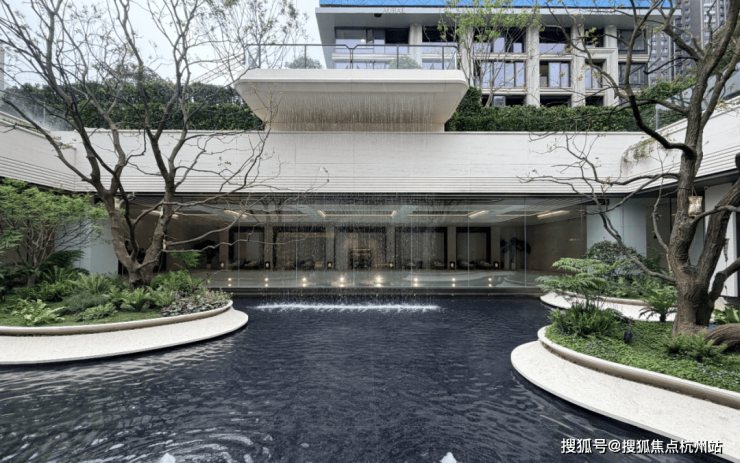 “一帘水幕连天地,半园自然半园家”。下沉庭院的水境森林以无界水池环绕,立体水幕将公园与会所、下沉庭院串联,水声隔绝了外界喧嚣。你在这里散步、静坐、会友,不会有外人打扰。
