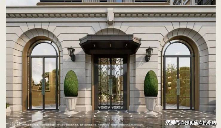 首先,项目西侧人行主入口大门,采用经典的拱券序列符号,以浅色石材、咖色金属与玻璃的精致搭配,营造出复古奢华的归家仪式!