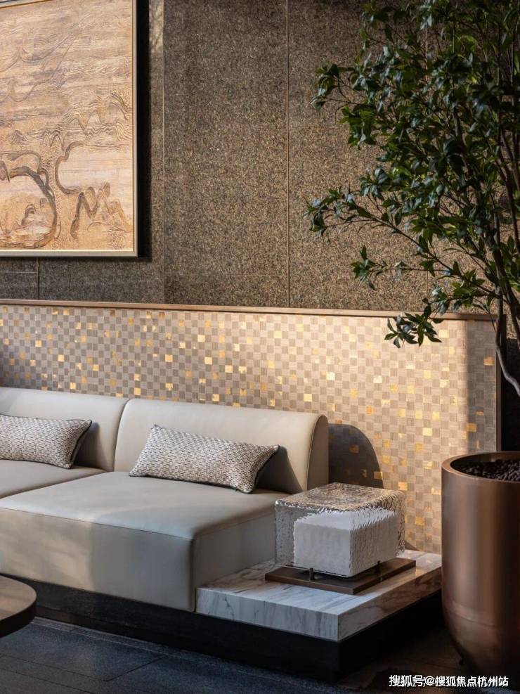 黄金丝绸大理石流转着真丝般的光泽,白玉与卡里冰玉小台映照天光云影。