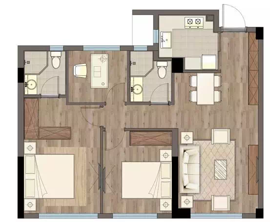 7号楼建面约99方做到三房两厅两卫,整个户型格局工整,主卧带有独立的衣帽间和卫生间,尺度舒适。约9.9米的面宽,江景、园林景观就在窗口。