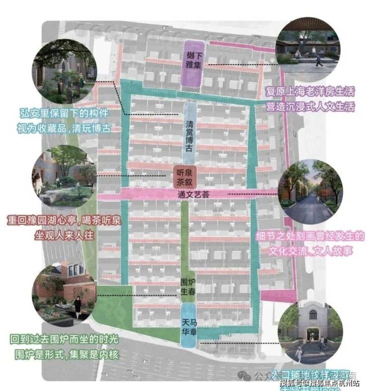 在社区的中轴上,弘安里植入记忆的符号与生活的画面,从入口处「天马华章」迈步前行,「围炉生春」「通文艺荟」「听泉茶叙」「清赏博古」贯穿到此次实景开放的「樾下雅集」,海派生活画卷昨日重现。