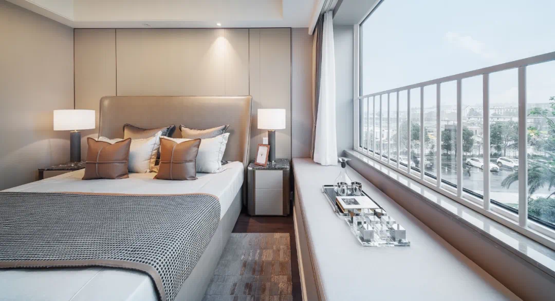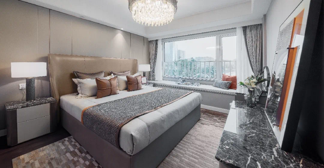 约18㎡阔绰主卧,配备观景飘窗、独立卫生间,并预留了步入式衣柜,优雅私密,满足太太的爱美之心。