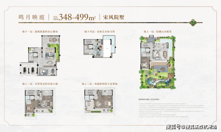 在合院产品中,开创性引入 “一宅六院” 设计,构建出地下挑高光院、南向诗意庭院、北向入户礼院、二层观景静院、三层巨幕心院、三层露台星院。