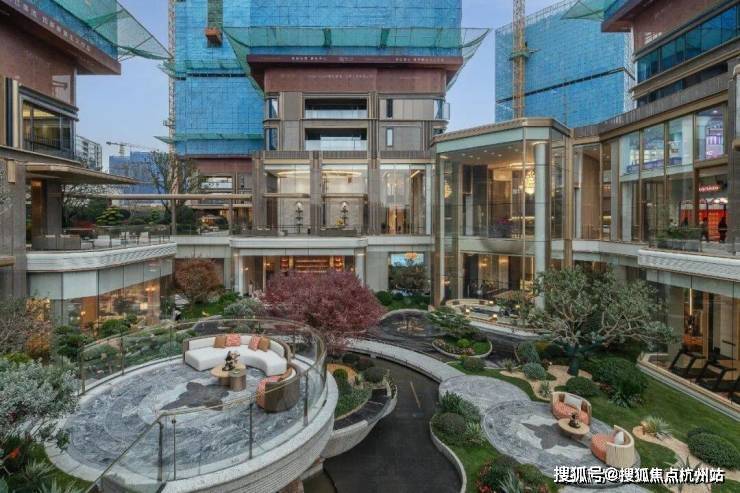 步入前厅,高达约14米的巨幅玻璃幕墙后,钱新二期面积最大的下沉式庭院映入眼帘,超10米的垂直高差构建出钱二独有的“高山流水”立体景观。