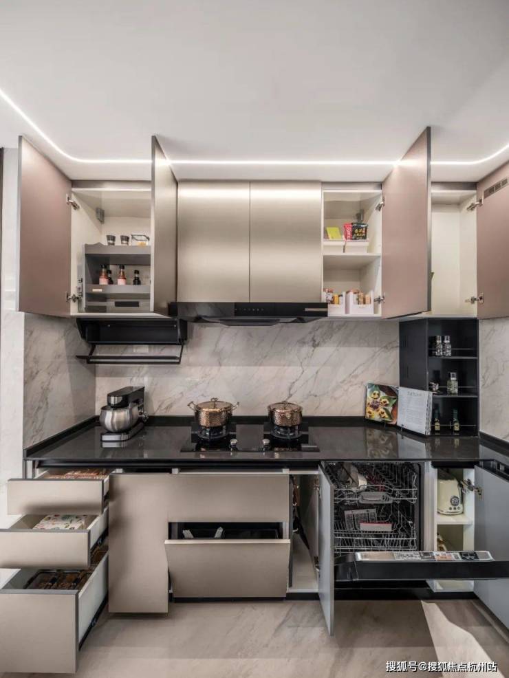 而在厨房,这种极致收纳的思维被简化为“一步原则”:收纳空间全部打开,几乎能填满整个厨房空间,这些收纳空间不是随意塞满的,而是根据日常烹饪习惯的频率来贴心规划的,能保证你在操作半径内触手可得,整个烹饪能一气呵成。