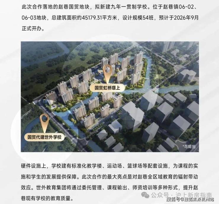 9月5日“世外”正式官宣落定赵巷,这所世外托管的公办九年制学校为国贸代建学校,与项目仅一路之隔,未来大概率对口。 (期房不承诺学区,学区划分以教育局公布为准)。