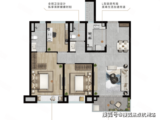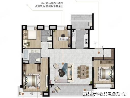 高层产品主力建面约 98-156㎡,以 3-4 房为主,精装交付,均价约 2.4 万 /㎡起,总价约 220-400 万。98㎡三房两厅两卫,格局方正,动静分区,全明通透,三开间朝南,客厅连接南向观景阳台,采光面充足,主卧为套房设计,配备独立卫生间与观景飘窗,保障主人居住私密性与舒适度,次卧空间开阔,可作为儿童房或老人房,北向书房可灵活改造,适配不同家庭阶段需求,双卫设计,干湿分离,有效避免早高峰使用拥堵,空间利用率极高,是年轻刚需上车优选。