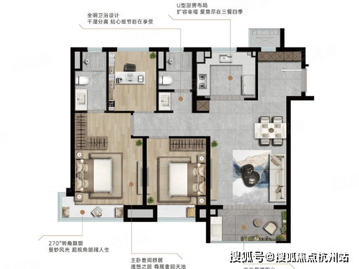 99㎡三房两厅两卫,南北通透,全明格局,三开间朝南,客厅带阳台,主卧套房设计,独立卫浴 + 飘窗,私密性强,次卧与书房分布合理,空间阔绰,居住舒适度高,总价 243 万起,刚需与首改皆宜。