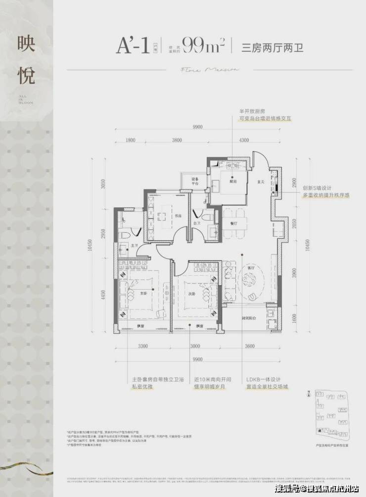该边套户型,不仅有270度的采光视野,主/次/客卧三大开间并立朝南,“含阳光量”十足。