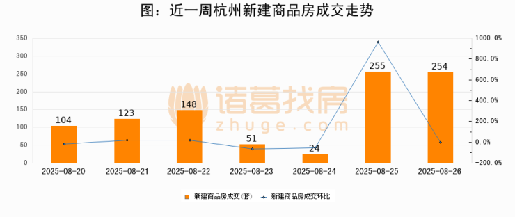 根据杭州市住房保障和房产管理局数据显示,2025年08月26日杭州新建商品房成交254套,较昨日减少1套,环比下降0.4%。近一周杭州新建商品房日均成交137套。08月26日单日成交254套,高于近一周平均水平85.4%。