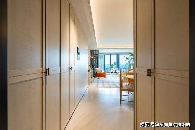 其次,建面约120㎡的过道的木饰面以及玄关储物柜门均是由影木打造。
