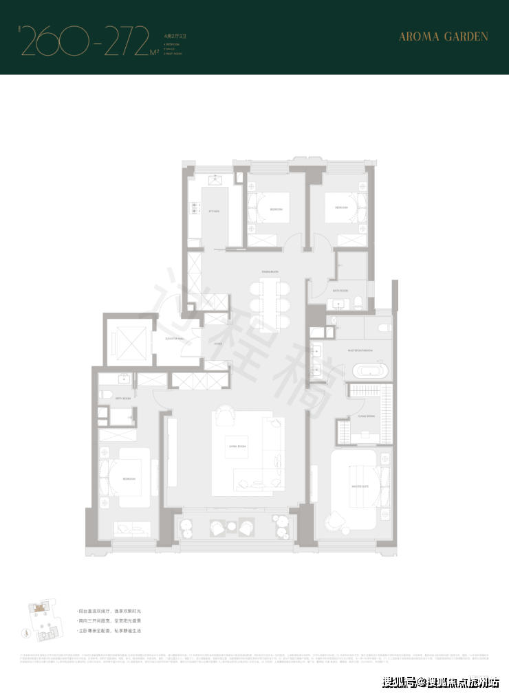 其中两个套房卧室都配备了双台盆+浴缸+淋浴+马桶豪华四件套,尤其主卧,面积高达约55㎡,功能性拉满,舒适度尽显。