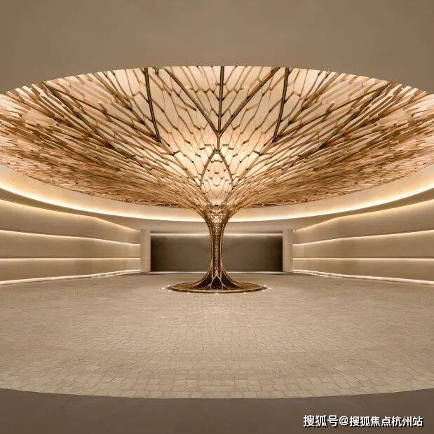 因项目整体抬高,从下沉庭院到架空层“空中花园”的落差极大,形成独特的峡谷地貌,杭序府的设计团队汲取九溪烟树为造园灵感,打造一个立体多维的城市溪谷交互园林;因项目毗邻江岸,杭序府的外立面以“站立的江潮”为灵感,
