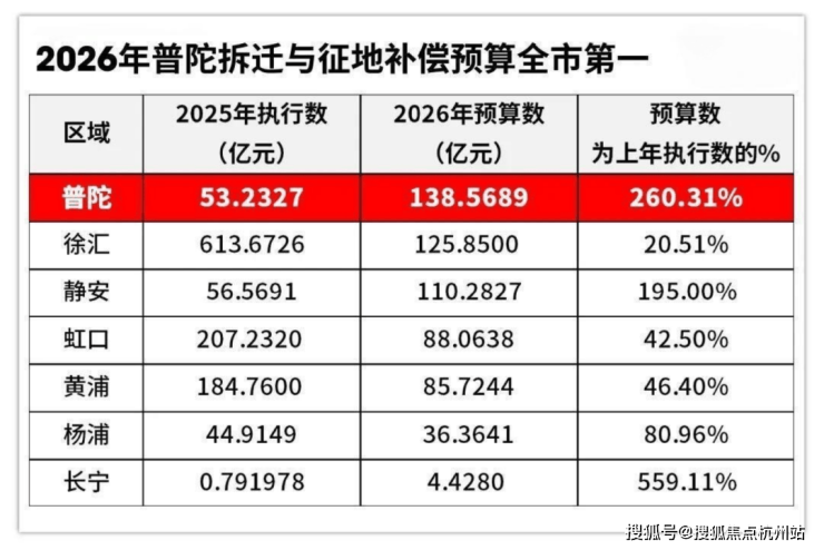 其次,2026年普陀拆迁与征地补偿预算高达约138亿,全市最高。 真金白银投入之下,普陀城市界面、市政配套将迎来新一轮大幅升级,区域发展全面提速。