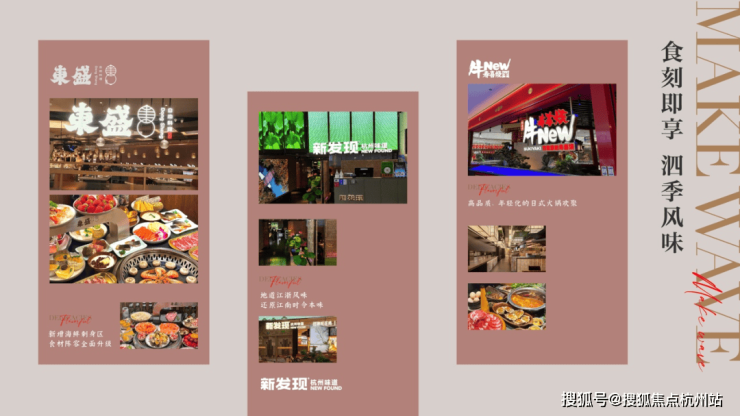美食集结: 醉庐·新上海菜 、 芸山季、鸟醺烧鸟居酒屋、牛排村、东盛碳烤自助料理、漾应的火塘 等品质餐饮,承包你的三餐四季;