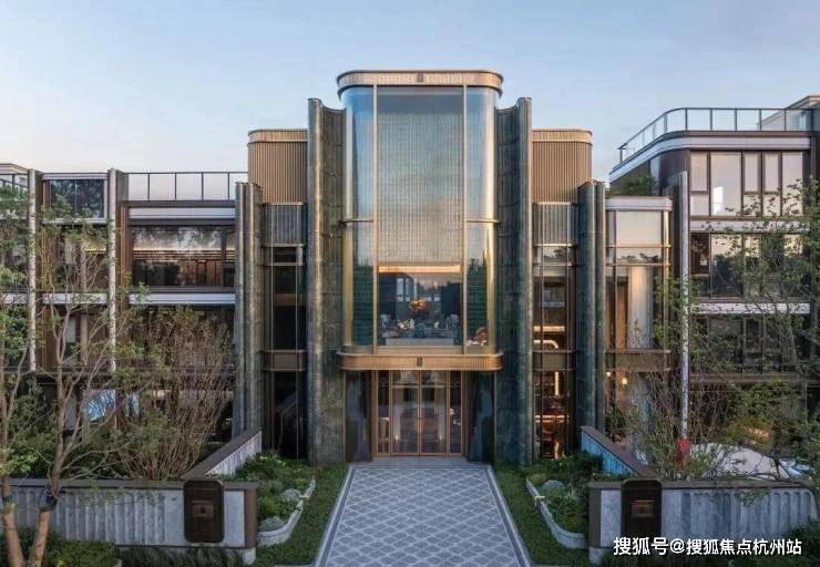 萃屿原墅立面采用大面积玻璃、金属线条、威斯康白石材,将松江新城的住宅建筑美学拉入下一个LEVE,尤其是香槟色金属线条如剪裁合体的高级西装骨架,勾勒出建筑的精致轮廓