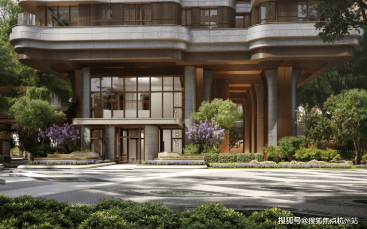底部以石材和金属结合的曲线异形巨柱抬高建筑体量,构筑了廊柱与动态景观空间,既满足了尊贵的入户大堂需求,又释放了底层空间的潜力,进一步提升了低层住宅的采光效果和视野范围,从而营造出更为宜人的居住环境。