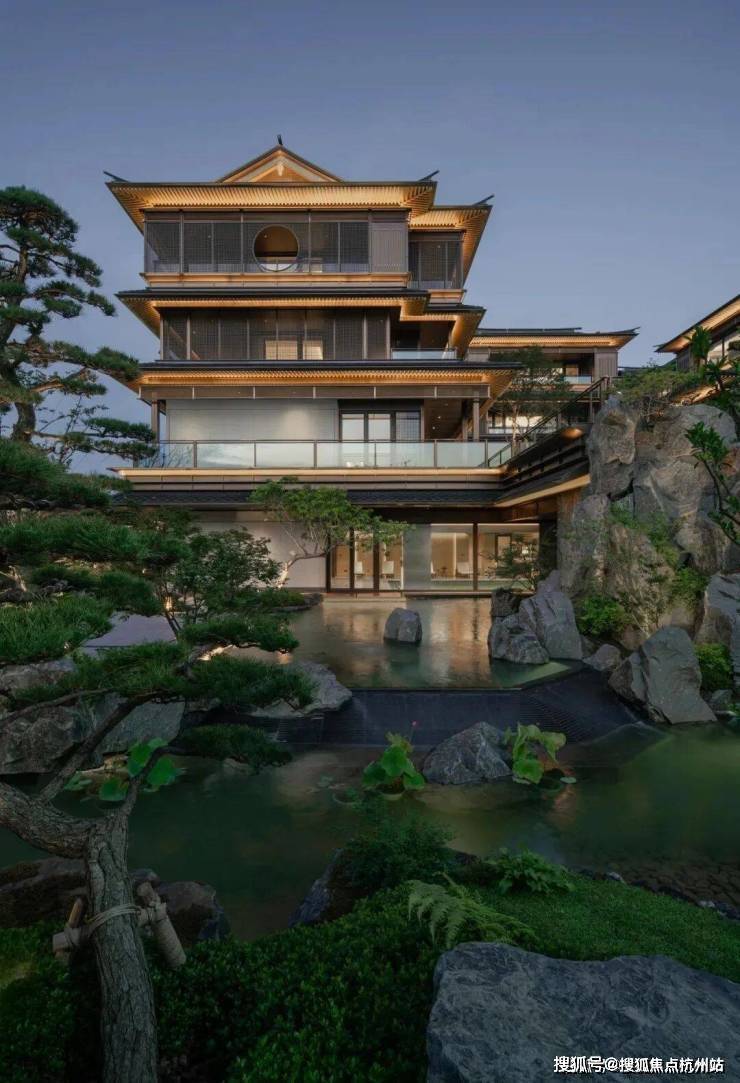 建筑立面:古今交融的诗意表达:外立面以香槟金铝板为基调,搭配蓝眼睛石材与玻璃幕墙,融合传统歇山重檐、纳福悬鱼等元素,既保留宋式建筑的对称美学,又赋予现代建筑的轻盈通透。合院组团采用三面庭院设计,L型景观面与环绕式檐廊,将超山梅影、丁山湖光引入每一扇窗景!