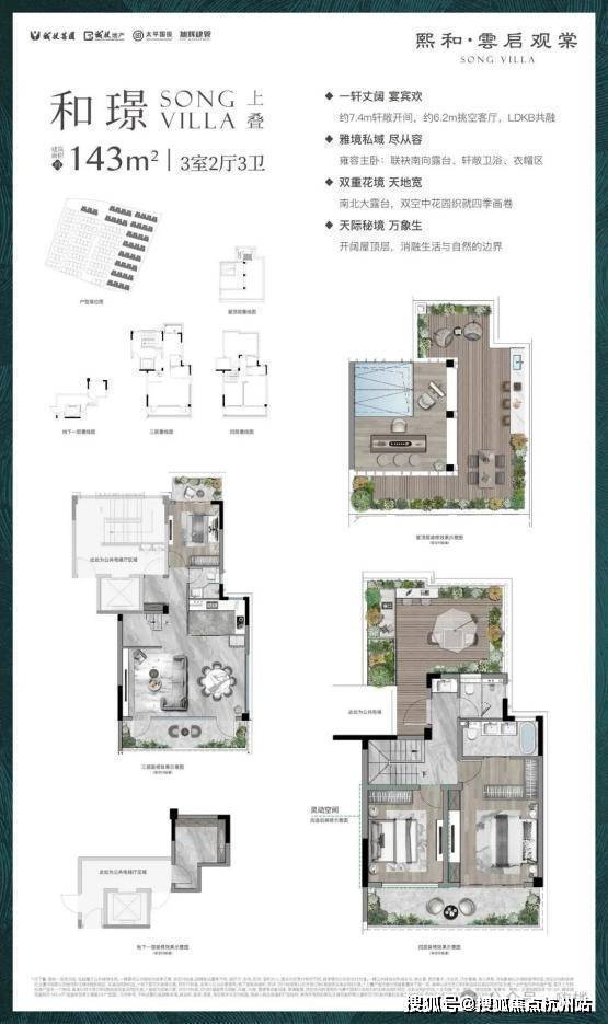 上叠(约143㎡): 设计为3房3卫,赠送客厅挑高,拥有南北双露台,屋顶更赠送一个星空大露台,仰望星辰,意境非凡。