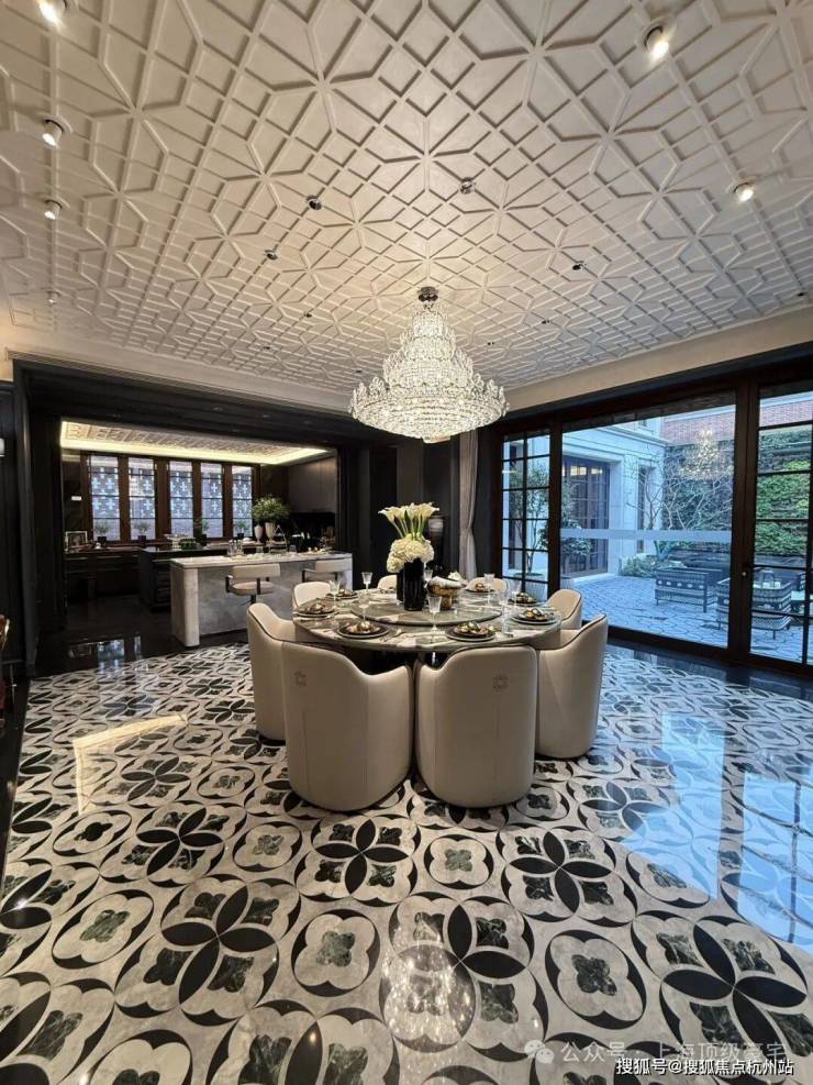 建筑面积约495㎡传家大宅,海派气质内外辉映;深色木饰面与柔和的刺绣主背景,框定空间层次格局,营造稳当厚重的氛围基调,法式留白的墙面与顶部造型,与原筑提取的典型拼花地砖相呼应,经典的精致与典雅,海派传家大宅的气度不言而明。