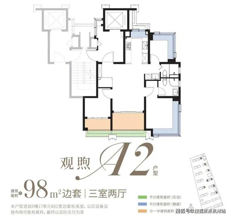 约98㎡3房:类一梯一户、全屋飘窗为标配,双阳台+花池是核心亮点(市面双阳台户型起步多为约110㎡),整体附赠约23㎡,是罕见的高实得率精致户型。