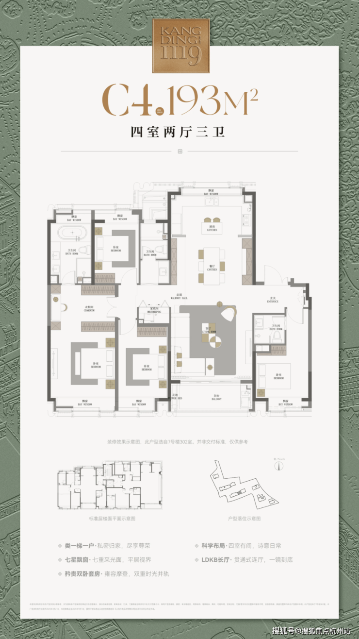 以建面约193户型为例,卫浴设备采用国际品牌如唯宝、高仪、卡德维等,厨电品牌采用嘉格纳,全套配置油烟机、灶台、洗碗机、双开门冰箱、蒸烤一体机等,同时装配德国美诺洗衣机烘干机套装。