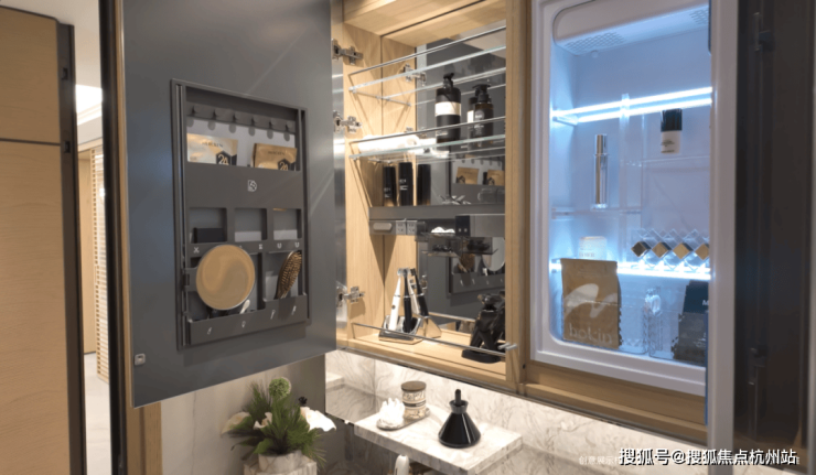 主卫空间则化身私人美学沙龙, 科勒维 C美研龙头可过滤余氯、兼具微气泡洁面功能,奥普光子嫩肤浴霸让沐浴兼具护肤之效,再搭配美妆冰箱与镜箱,组成独有的“美颜四件套”。