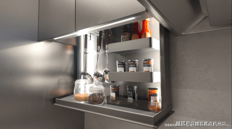 更让人惊喜的是,更高的得房率也带来了更多的收纳空间,室内收纳表现相当亮眼:从镂空门板屯菜柜到电动调味舱(120户型为手动调味舱),再到踢脚抽与倾易抽,六大超级收纳系统让厨房永葆整洁。客厅均自带餐边柜,满足业主满足多样收纳与物品展示需求。