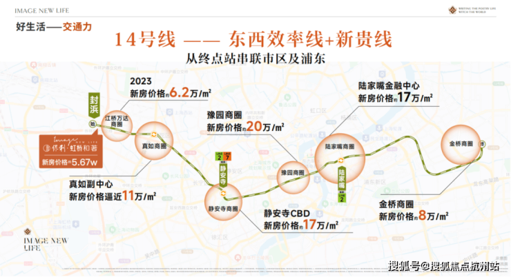 14号线和嘉闵线(在建中)双轨交汇,3站虹桥枢纽,5站普陀,一脉静安。距14号线地铁口仅约200米,步行2分钟即达。作为始发站,通勤有位,30分钟直达静安寺,45分钟抵达陆家嘴。同时相较沿线动辄10万+的房价,本项目“5”字头单价,堪称“外环外的预算,中环级的享受”。
