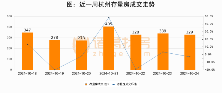 从存量房来看,2024年10月24日杭州存量房单日成交329套,比昨日减少10套,环比下降2.9%。从近一周存量房成交来看,杭州存量房日均成交套数为328套,10月24日单日成交329套,高于近一周平均水平0.3%。