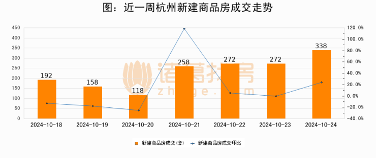 根据杭州市住房保障和房产管理局数据显示,2024年10月24日杭州新建商品房成交338套,较昨日增加66套,环比上涨24.3%。近一周杭州新建商品房日均成交230套。10月24日单日成交338套,高于近一周平均水平47%。