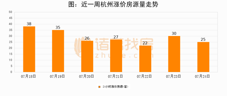 根据诸葛找房数据显示,杭州24小时涨价房源量为25套,较07月23日减少5套,环比下降16.7%。与此同时,涨价房源占比小幅回落,对于购房者来说是一个入市窗口期,购房者可抓住时机入市。