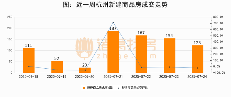 根据杭州市住房保障和房产管理局数据显示,2025年07月24日杭州新建商品房成交123套,较昨日减少31套,环比下降20.1%。近一周杭州新建商品房日均成交117套。07月24日单日成交123套,高于近一周平均水平5.1%。