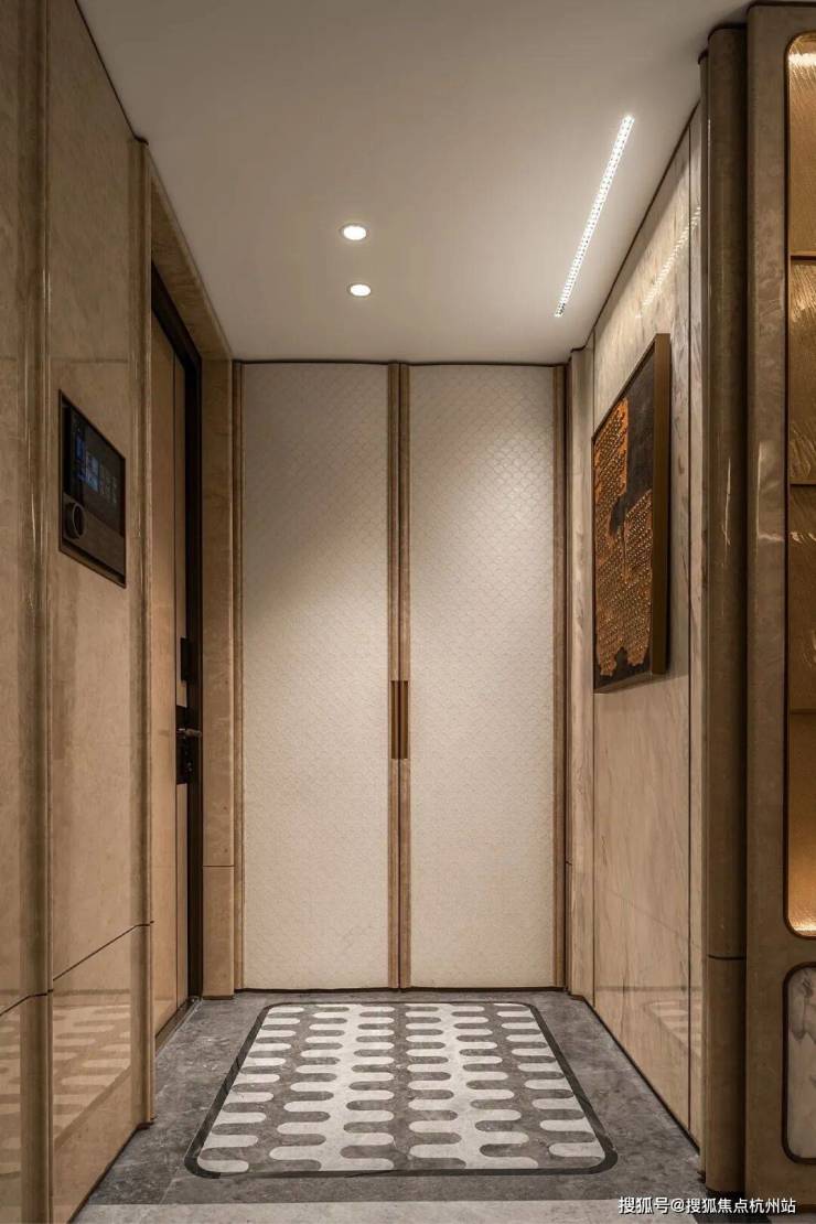 采用类一梯一户设计,电梯门开,迎面便是私家前厅。这片过渡空间,不仅是玄关的延伸,更是一道情绪的过滤器——它将电梯厅里的偶遇寒暄、城市的嘈杂纷扰,轻轻挡在门外。当您转身关上电梯门的那一刻,便完成了从“社会人”到“居家者”的身份切换。