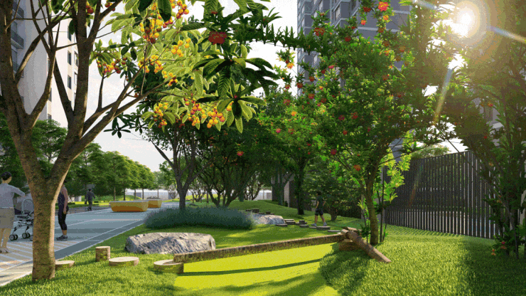 社区中围绕“一轴两环四季四趣”打造的内部景观,能让客户感受到实际的未来,以一条中轴线配合“中心花园、亲子互动园、架空层健身区”等区域,实现四季花园景观与功能完美契合。