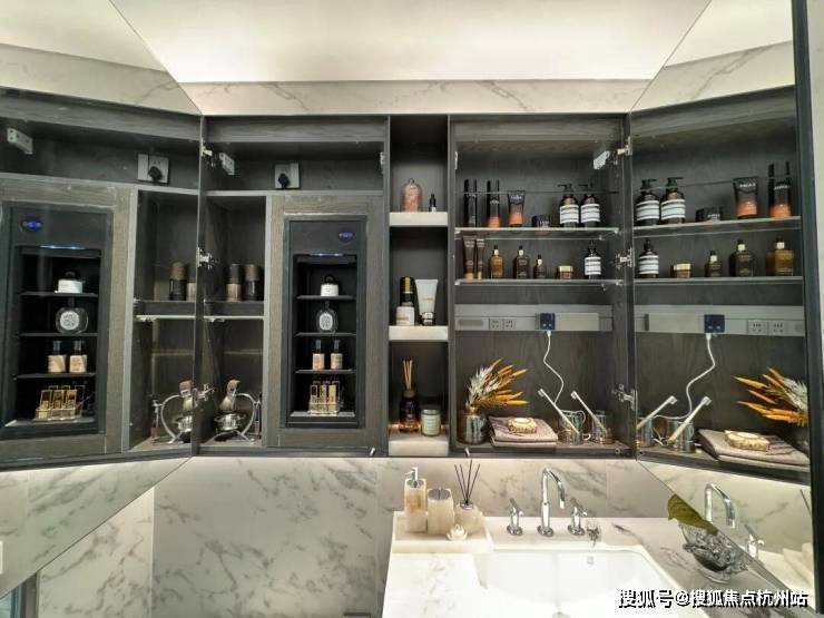 双卫配置, 其中一个做了干湿分离,科勒台盆+双智能马桶+高仪花洒,除雾镜柜均内置了牙刷消毒器、预留吹风机插座。主卫镜柜还有美妆冰箱,收纳空间相当充足。