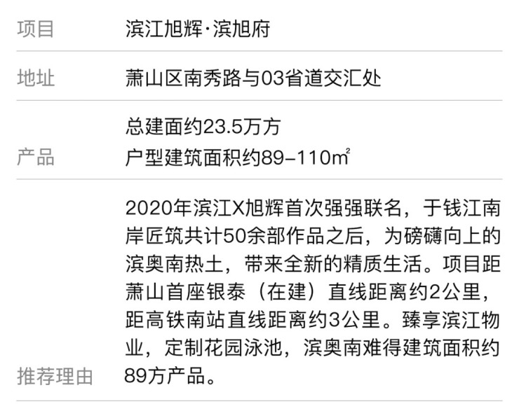 本项目核准地名为“滨旭府“。本广告为要约邀请,买卖双方的权利义务以双方签署的《商品房买卖合同》及附件等书面协议为准。本公司在交易过程中提供的各类配套信息均来自政府相关主管部门或机构公开信息或商业合约或现场现状,相关信息更新截止于本公示所载印制时间,后续各类相关信息可能发生变化。各类配套设施相关较新信息及情况,须以政府相关主管部门、机构公开较新信息为准。本文中对项目周边环境、交通、教育及其它配套设施的介绍,旨在提供相关信息,不意味着本公司对此作出了承诺和保证。信息采集时间为2020年7月。本文发布时间为2020年7月25日,有效期1个月。本项目开发商为:杭州兴塘置业有限公司。本公司保留对本宣传修改的权利,敬请留意较新资料。