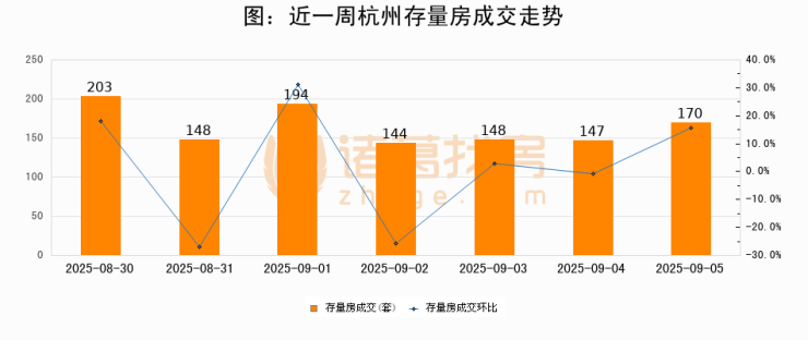 从存量房来看,2025年09月05日杭州存量房单日成交170套,比昨日增加23套,环比上涨15.7%。从近一周存量房成交来看,杭州存量房日均成交套数为164套,09月05日单日成交170套,高于近一周平均水平3.7%。